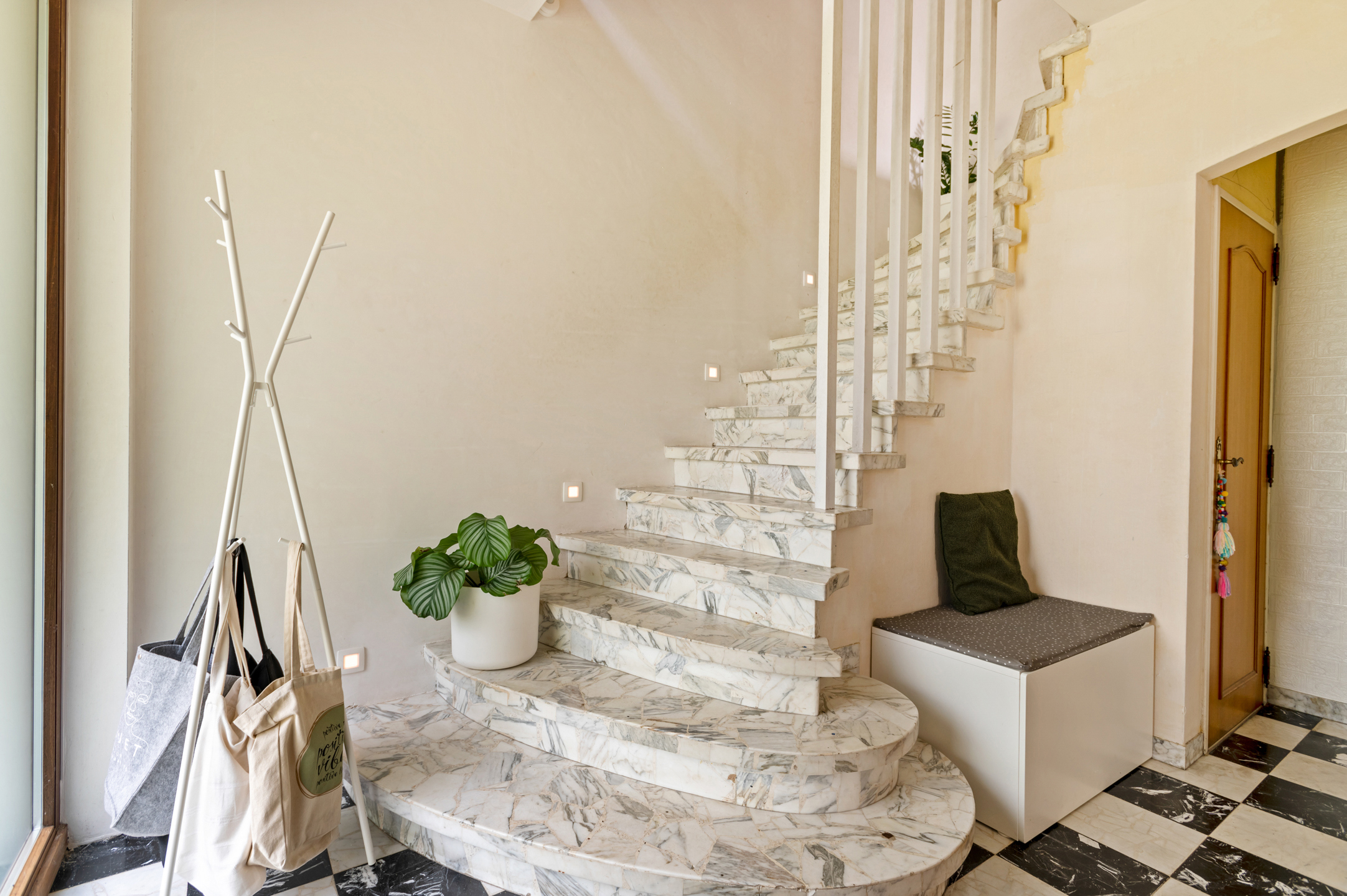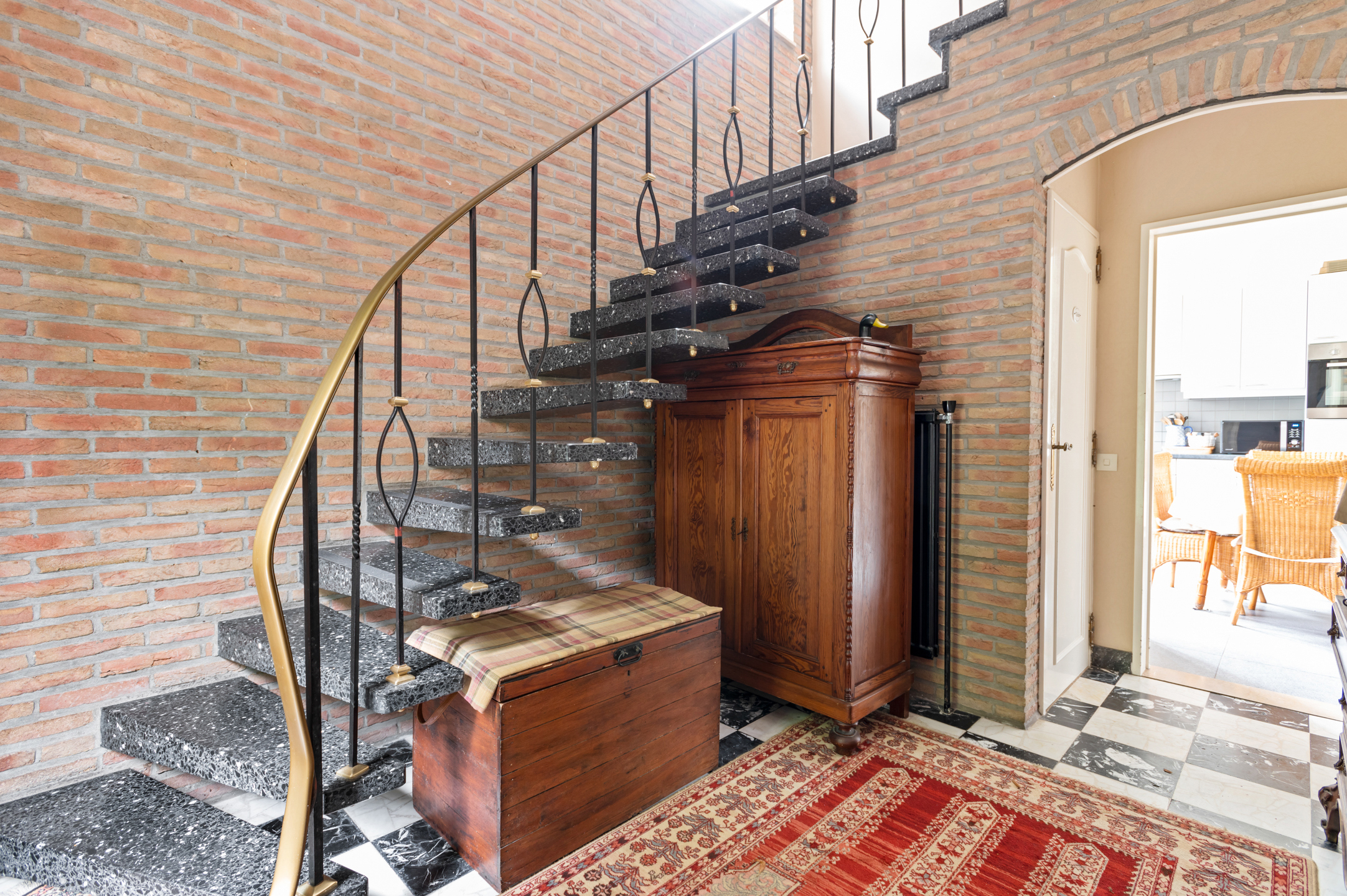 De rechterwoning werd grondig gerenoveerd met onder meer vloerverwarming, nieuwe elektriciteit en isolatie. De ruime leefkeuken van 39m² en de zithoek van 28m² zorgen voor een aangename leefruimte met veel licht. Op de verdiepingen zijn er zeven slaapkamers, een af te werken badkamer en voorzieningen voor een extra badkamer.