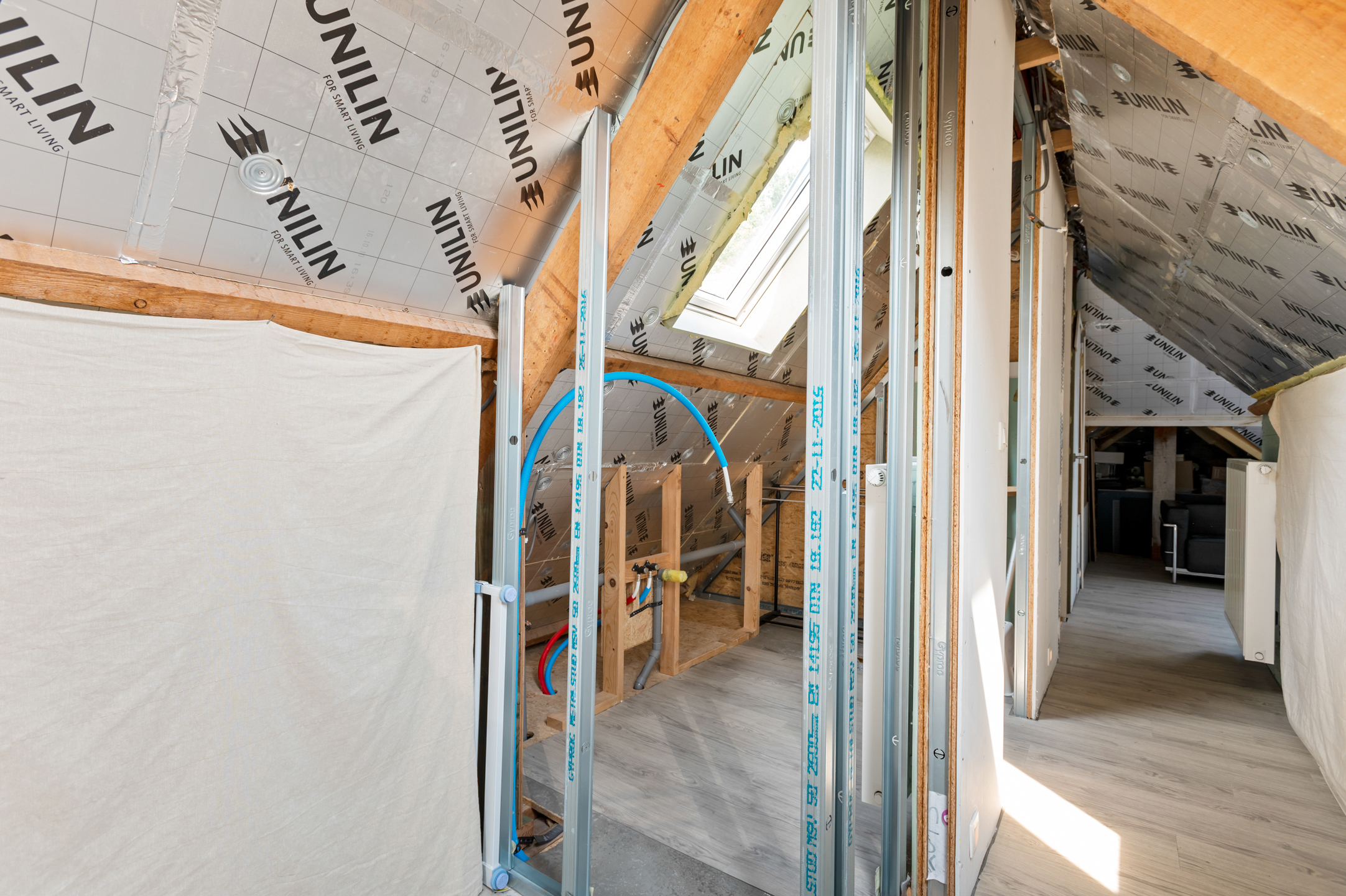 Op de eerste verdieping bevinden zich vier slaapkamers (21m²- 16,7m² – 14m² en 9,5m²), een verder af te werken badkamer en een afzonderlijk toilet. De tweede verdieping telt nog drie slaapkamers (tweemaal 16,7m² en 14,2m²) waarvan de plafondafwerking moet gebeuren, en er is ruimte voorzien voor een extra badkamer – alle technieken zijn reeds geplaatst.