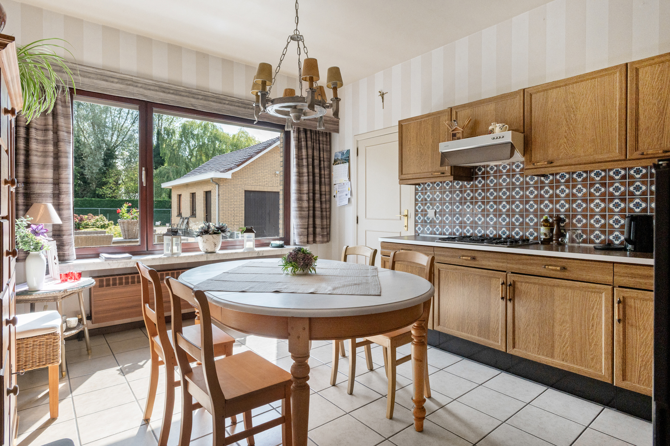- Keuken (16m²) met fraai zicht op de achtertuin en geïnstalleerd met o.a. een gasvuur, een dubbele lavabo, een koelkast, spatwand in verzorgde cementtegel, voldoende tabletruimte en vele opbergkasten.