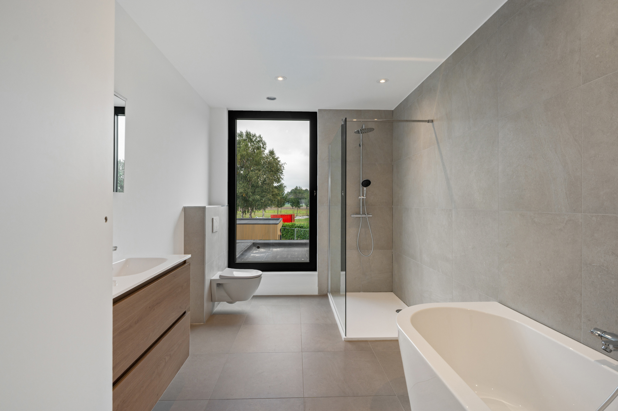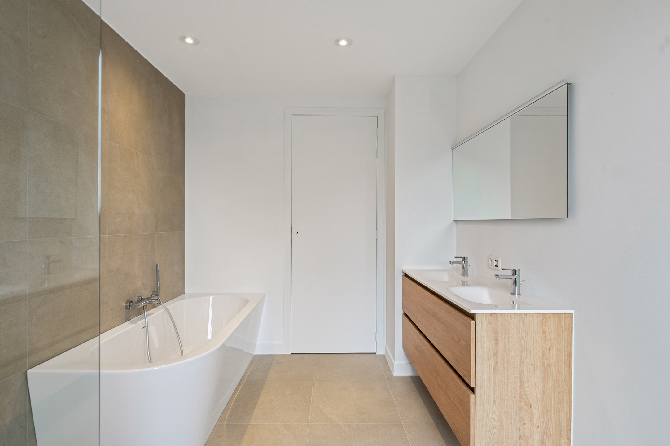 - Modern afgewerkte badkamer (10m²), voorzien van vloer- en muurtegels, een ligbad, een inloopdouche en een dubbele lavabo met meubel en spiegel.
