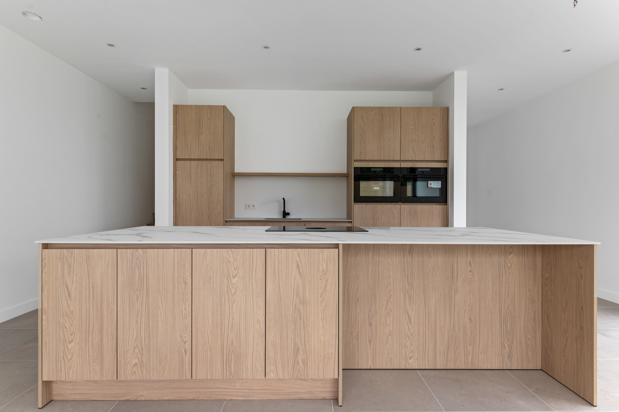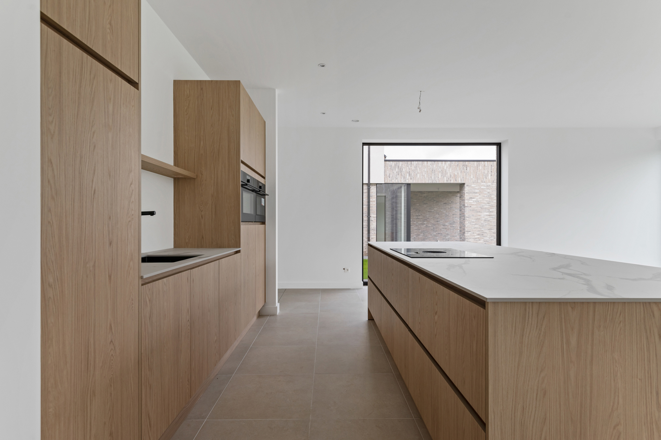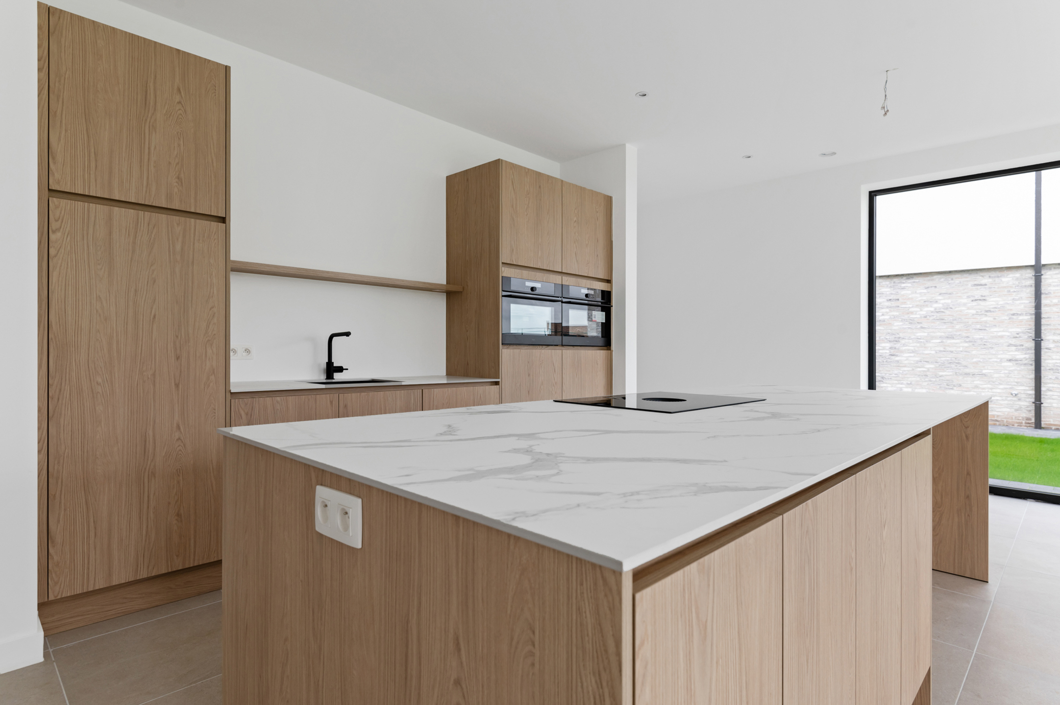 - Achteraan een lichtrijke leefkeuken met eetgedeelte (totaal 42m² - Keukens Konings) dewelke luxueus afgewerkt werd en voorzien is van o.a. een vaatwasser, een inductievuur met BORA-dampkap, stenen werkblad, combinatie oven/microgolf, 2de oven, koelkast, een ontbijthoek, en veel tablet- en kastruimte.
