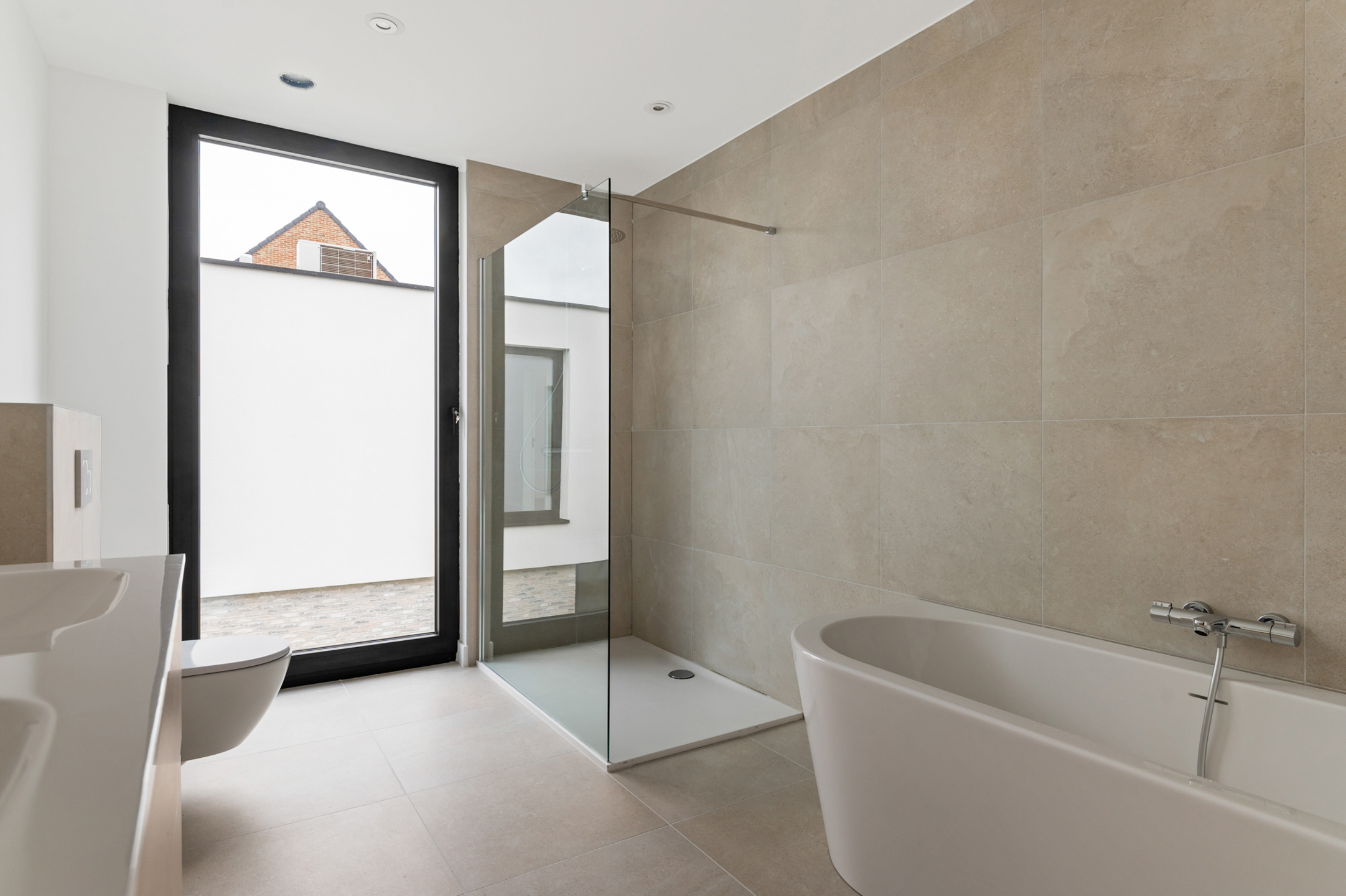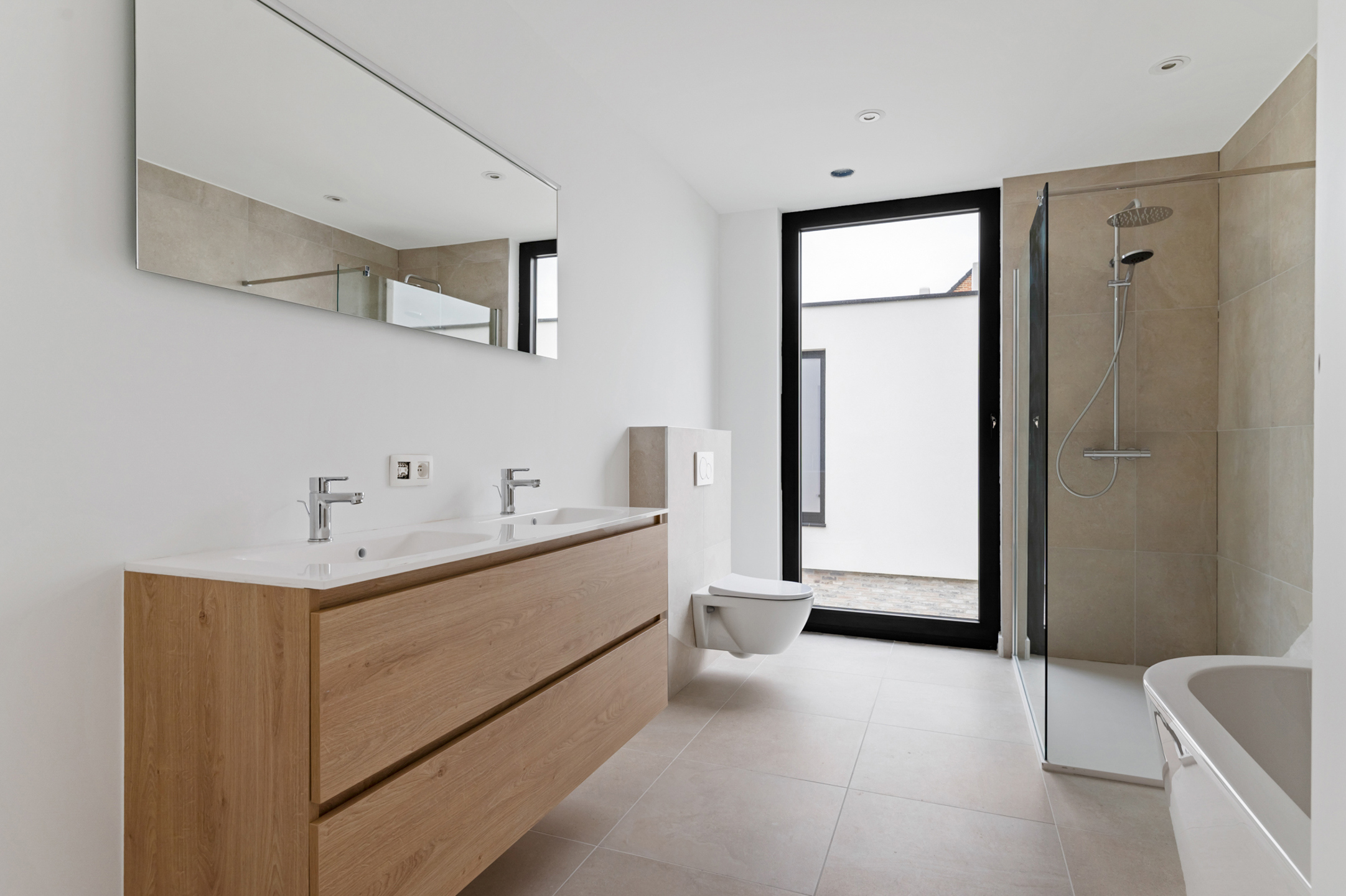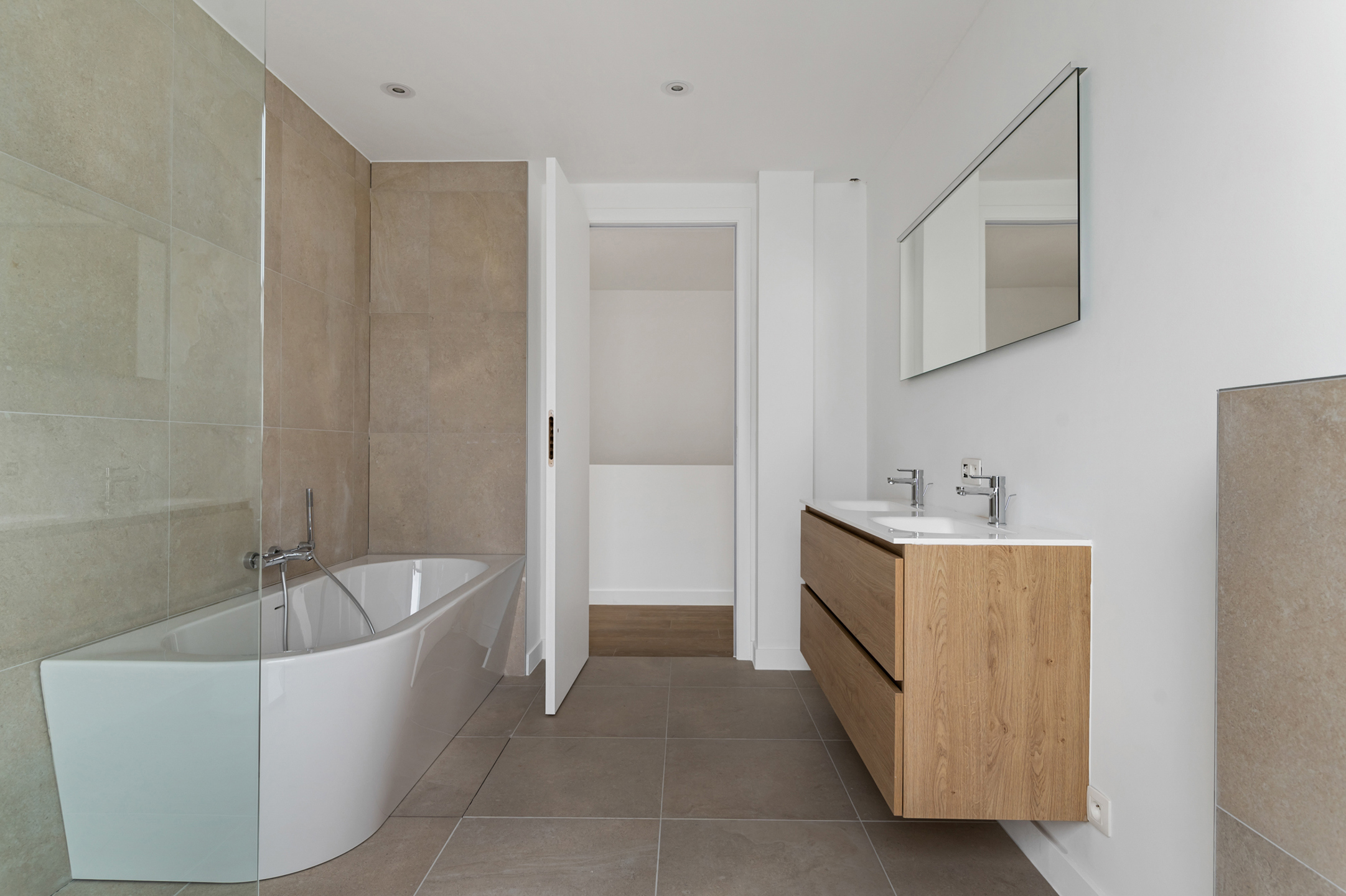 - Modern afgewerkte badkamer (10m²), voorzien van vloer- en muurtegels, een ligbad, een inloopdouche, een toilet en een dubbele lavabo met meubel en spiegel.