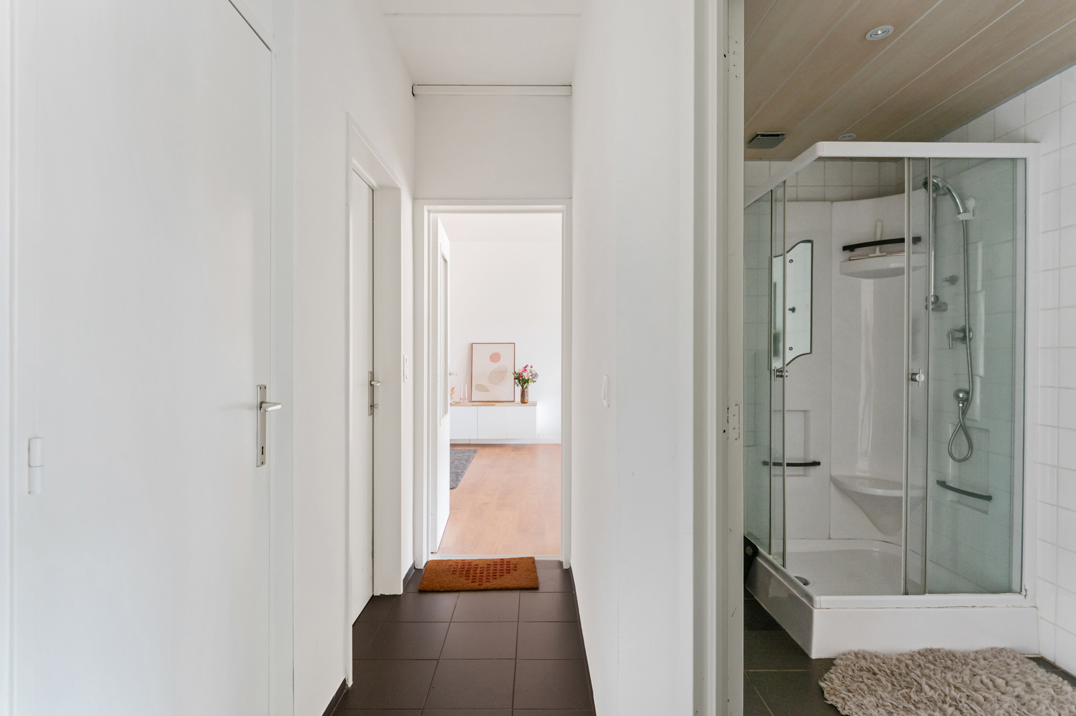 - Volledig betegelde badkamer (5m²), voorzien van een douche, een lavabo en opbergruimte.