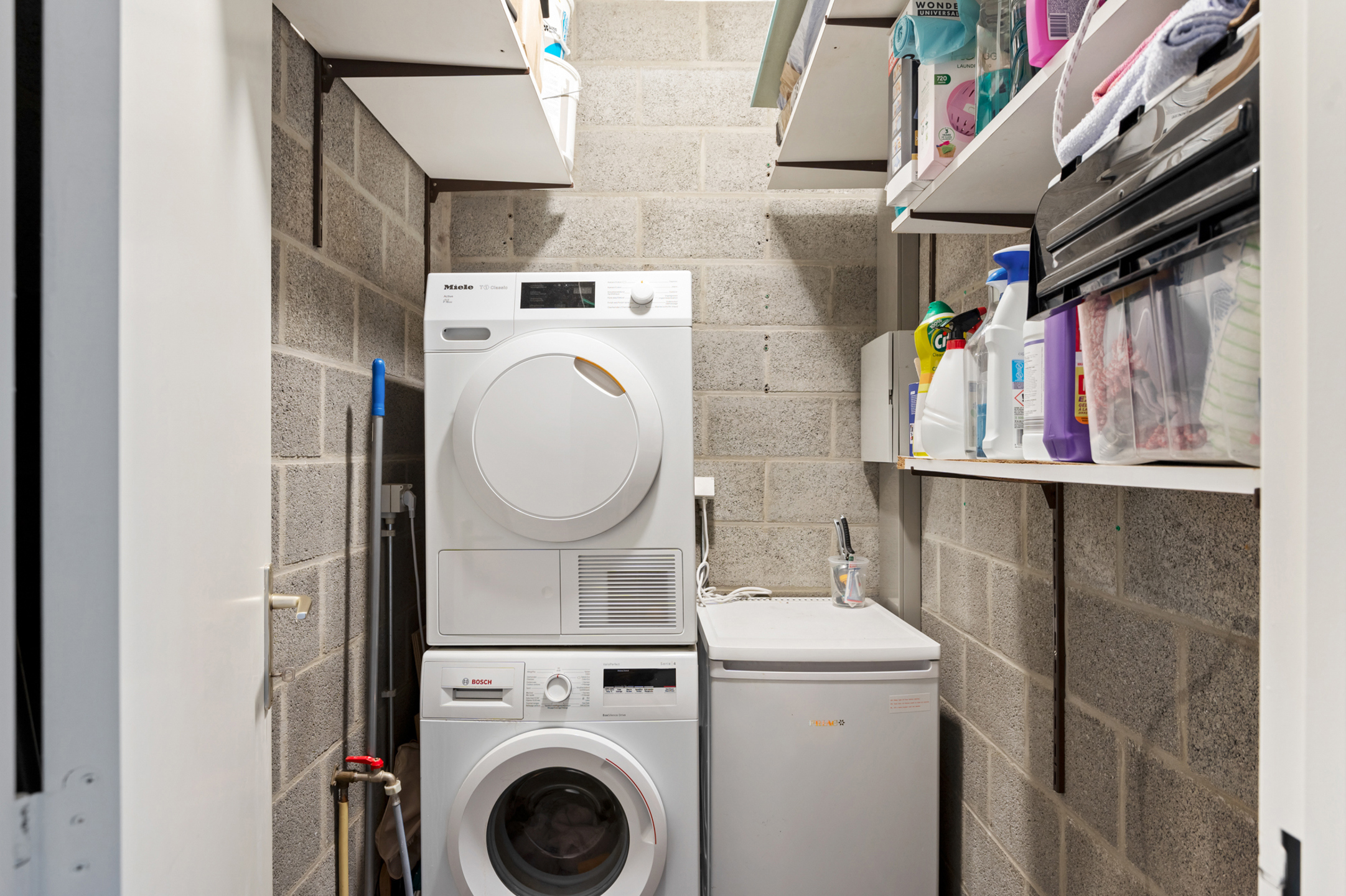 - Handige bergplaats, met de technieken en aansluiting voor wasmachine/droogkast,