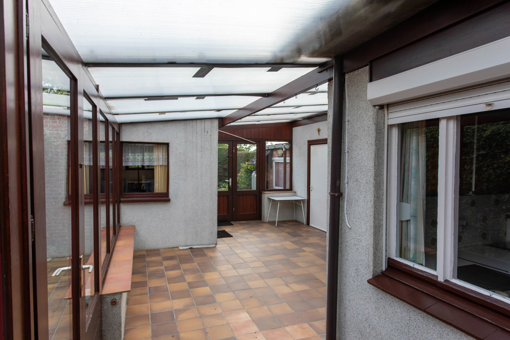 Op het gelijkvloers bevinden zich een woonkamer, keuken, badkamer en een veranda met zicht op de tuin.