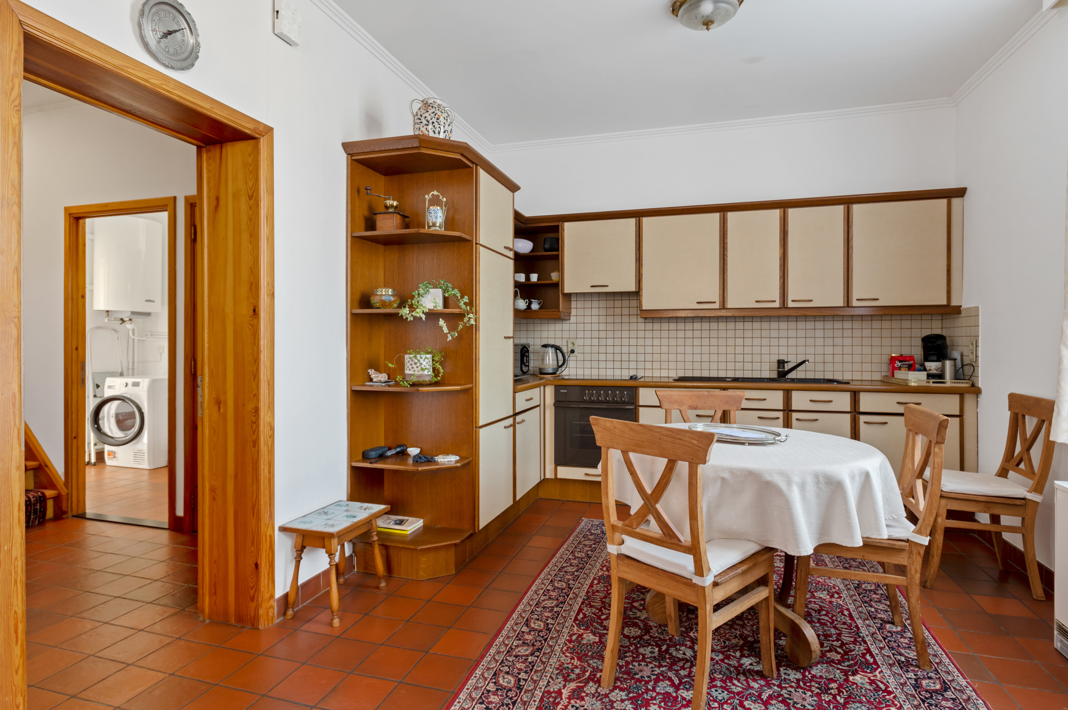 • Leuke keuken (ca. 15m²) voorzien van onder- en bovenkasten, een aanrecht in natuursteen, een elektrische kookplaat met bijhorende dampkap, een oven en een vaatwasser.